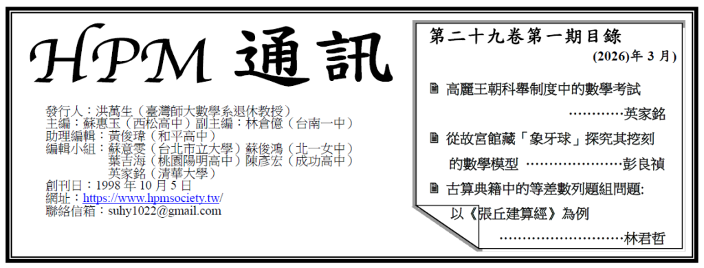 HPM通訊 第29卷第1期出刊了Vince Yang2026-04-19臺灣新聞 目錄: 高麗王朝科舉制度中的數學考試從故宮館藏「象牙球」探究其挖刻的數學模型 古算典籍中的等差數列題組問題:以《張丘建算經》為例 立即下載本期通訊 Post Views: 4